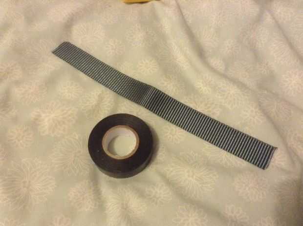 Cinta aislante, compré un pack de 8 rollos surtidos 20m por £4.99 de eBay pero usted puede comprar los individuales para tan poco como 60 peniques. 1m de 1" correas de Nylon, yo tengo la mía para £1.79 - también de eBay. 1 metro es de 40". También necesita material tijeras para cortar a través de la cinta, una cinta métrica.