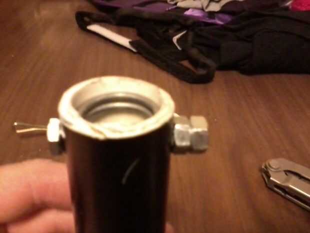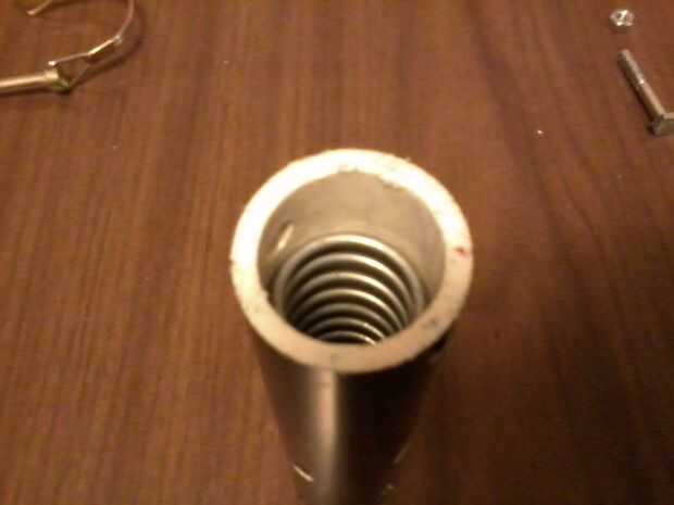 a continuación, poner el resorte en el PVC y empuje el perno a través de la primavera, trabándolo en el lugar. Coloque las tuercas y apretarlos para fijarlos en su lugar. También puede usar una tuerca de seguridad si quieres, pero me gusta ser capaz de tomar distancia y armar sin reemplazar la tuerca de nylon cada vez.