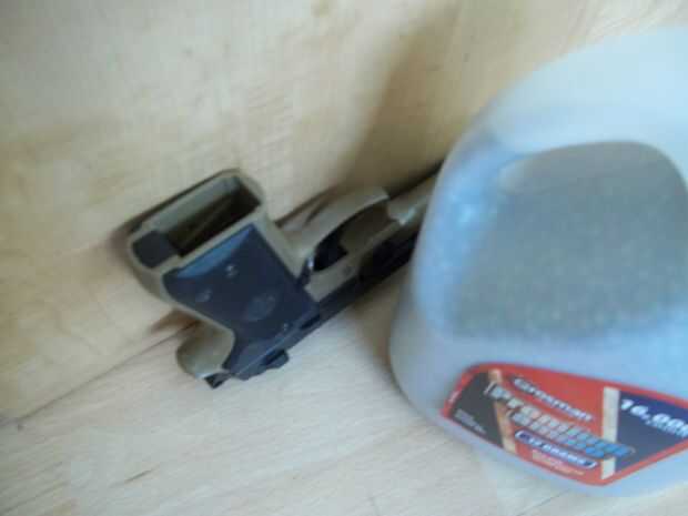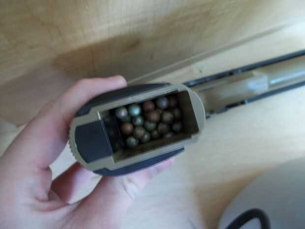 Pop hacia fuera el clip y póngala a un lado. Ahora punta del rifle boca abajo y vierta el BB en el lugar donde va el clip.