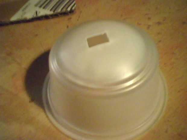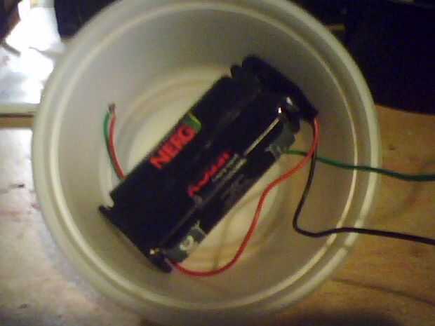 A continuación orificio cuadrado batería pack en forma en el cartón con una tira de boxcutter y tijeras, los cables con un pelacables o tijeras de las y conectar 2 trozos pequeños de alambre al interruptor antes de que tornillo pegamento lo en su lugar dentro de la tapa de botella beber,