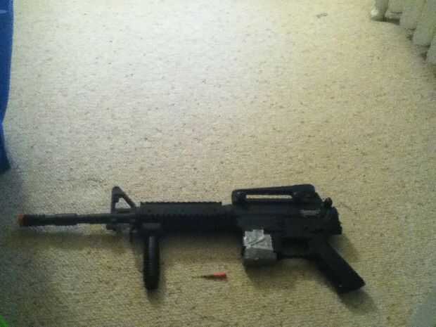 se trata de una pistola de dardos de goma con que hice que dispara dardos mini.Paso 1: fuentes de What you need is1. fichas2. un rifle de juguete3. bandas de goma4. brochetas de5 tijeras6. un cuchilloy alguna cintaPaso 2: paso 1 primero necesitas sac