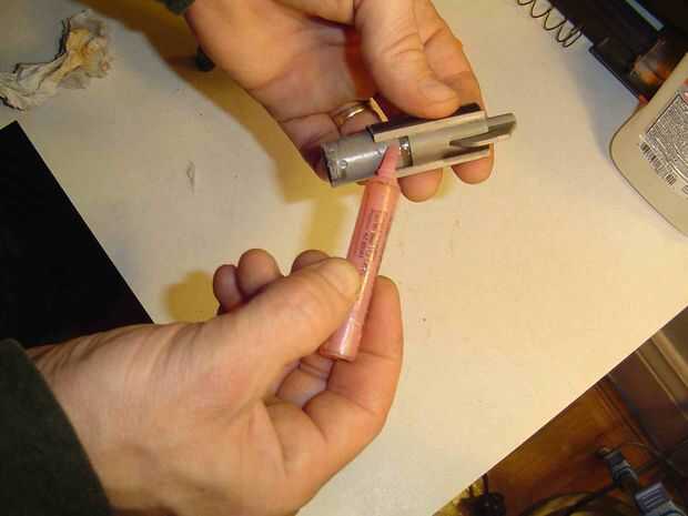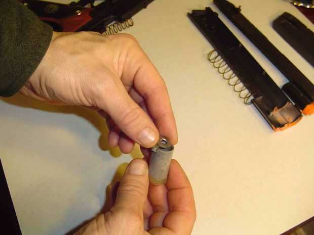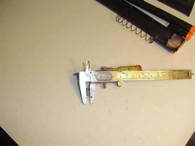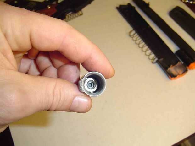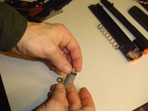Ahora coloque la tuerca de 7/16" en el pistón y la lavadora encima de la tuerca para que el muelle tiene una superficie plana en. Poner el pistón en el tubo, usted podría darle unas gotas de aceite para armas de la pelotilla también. Coloque el resorte en el pistón y WHALA! Se realiza.
