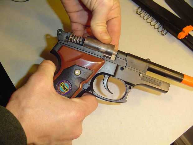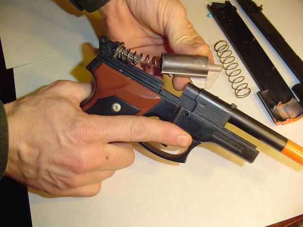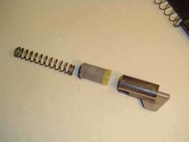 La foto muestra las tres piezas que componen la parte neumática de la pistola. El tubo de resorte y pistón compresión / cargador del trasero. cuidado con el tubo de compresión y pistón como velocidad del bozal de afectará a un rasgón en la junta tórica del pistón, o arañazos en el interior del tubo.
