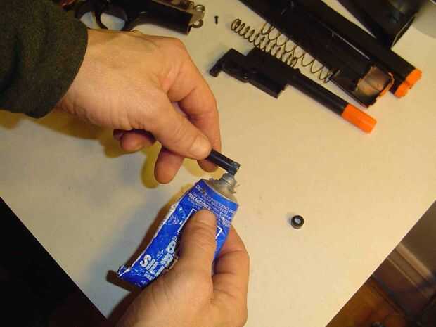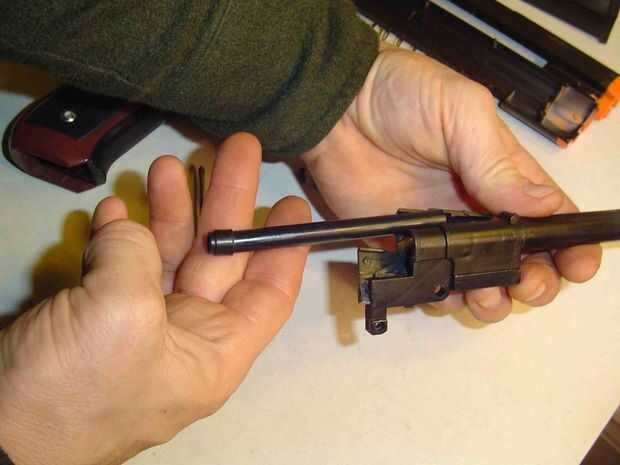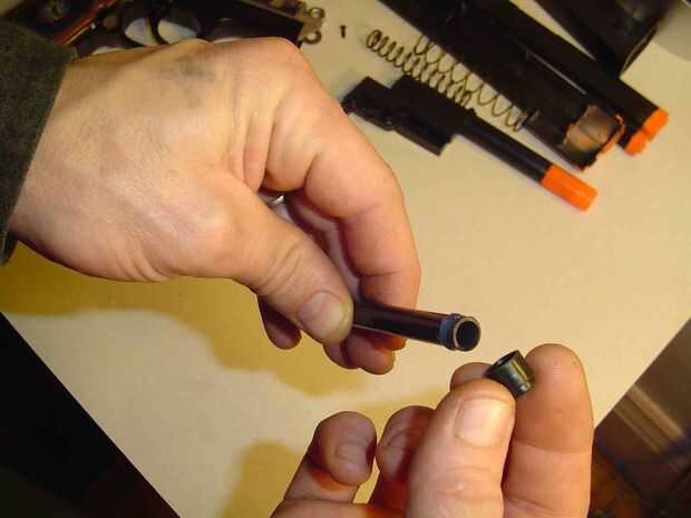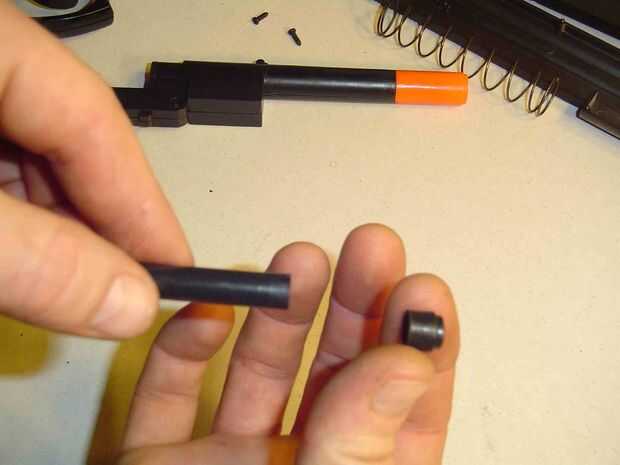 Uno tornillo sostiene el extremo de la recámara del cañón juntos, y que sangriento pegado en la tapa naranja por otro. No trate de sacarlo, quitar el tornillo y difundir aparte, que el real barril va a salir con un poco de trabajo. Sacar la goma y limpiar el interior del cañón con hisopo de alcohol y algodón. Mire dentro del cañón para asegurarse de que está todo limpio. Usted podría notar algunos baches en allí, no intente extraerlos cualquier acumulación interior del cañón. Los topes son para fomentar el diábolo gire hacia atrás cuando dejando la boca del cañón. No todos los barriles tienen esto.