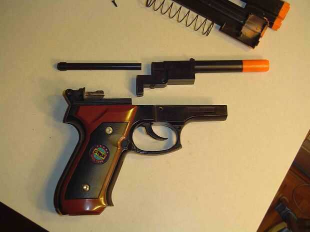 El montaje de barril consiste en exterior e interior (el real barril). En el extremo del barril del real es un sello de goma, sirve para dos propósitos 1. para sellar el tubo de compresión de barril y 2. hacer la pelotilla de airsoft de 6mm en el lugar hasta que el gatillo.