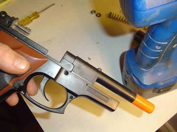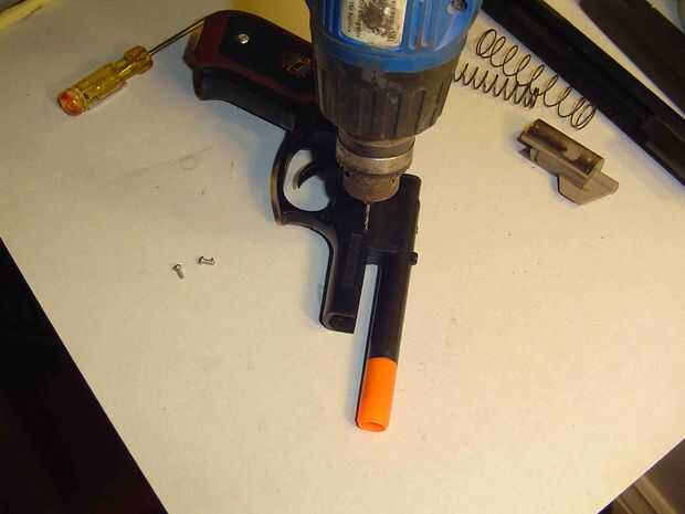 Taladre un pequeño orificio en la parte inferior de la pistola en el montaje de barril, no mucho espacio así que ten cuidado. Atornille los tornillos de los agujeros un poco más grandes que los agujeros. que deben ser una madera o chapa de rosca el tornillo con un punto.