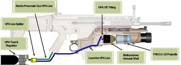 Cuando terminé el proyecto 2.0 () P.M.O.G. en el año 2014, comencé jugando con la idea de modificar mi lanzagranadas EGLM VFC que puede lanzar proyectiles sin las necesidades de proyectiles múltiples. Se me ocurrió la idea después de que vi el diagrama y las instrucciones de la costumbre de CrewChief (http://www.crewchiefpb.com/main/index.php?option=com_content&task=view&id=34&Itemid=1). Mi diseño original era aprovechar un águila fuerza polivalente Granada cáscara a un equipo de aire HPA, pero parece algo engorroso debido a la línea de aire largo (Figura 1).