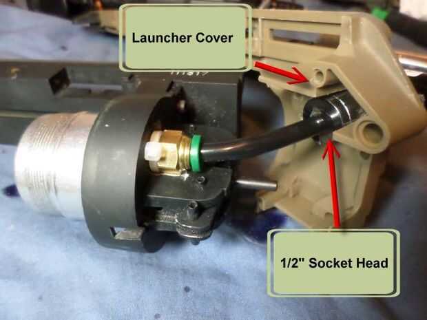 Use la cabeza de zócalo de 1/2 como guía para ubicar la posición en la tapa del lanzador para conectar la carcasa a la válvula de pulsador y el regulador (Figura 12). Marque la posición y utilizar el mismo método que antes para crear un agujero en la tapa que apenas le cabe la cabeza. Cortar parte de la base del encaje para que la línea de la macro se puede ejecutar sin problemas a través de (Figura 13). Instale la cabeza de zócalo en la tapa del lanzador. A continuación, coloque el 10-32 a 1/4 aire en la cabeza y verificar que el regulador no impida las funciones de la palanca de desacople rápido sobre el lanzador (Figura 14). Determinar la posición para el cordón ancho 3 mm que se utilizan para asegurar la válvula de pulsador y el regulador a la cubierta del lanzador. Marcar y taladrar dos agujeros en la tapa del lanzador recorra la brida (Figura 15). Coloque el cerrojo base junto con la cáscara del asegurado en la carátula del lanzador y determinar la longitud de la línea de la macro a la válvula de pulsador y el regulador. La línea de la macro debe ir en un arco suave del ajuste de aire de la carcasa a la de la válvula de botón (Figura 16). Debe haber pocas torceduras en la línea de la macro como sea posible. Acortar la línea de la macro poco a poco hasta llegar a su longitud óptima.