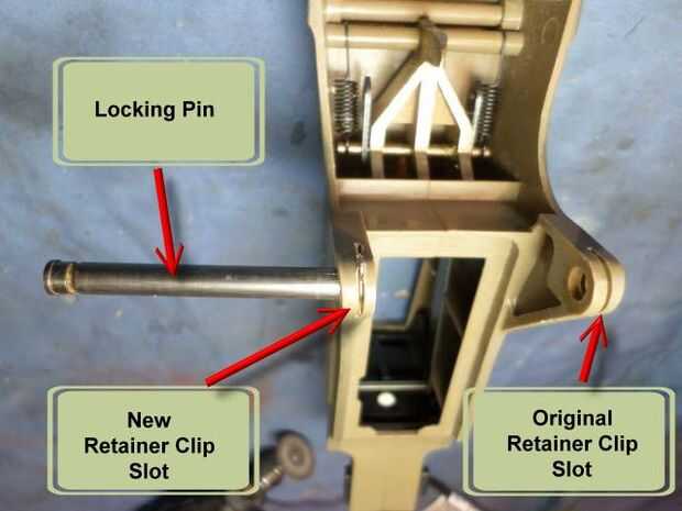 El pasador de bloqueo para el accesorio de disparo está diseñado originalmente para mover a la derecha del lanzador, que sería impedido por la válvula de botón (Figura 18). Para cambiar su dirección manteniendo la presilla, una ranura adicional necesitan ser cortados en el accesorio de disparo. En primer lugar, retire el clip de retención y el pasador de bloqueo. A continuación, usar Dremel rueda corte a baja velocidad para cortar una ranura en el lado izquierdo del accesorio de disparo reflejo original. Inserte el pasador de bloqueo del lado izquierdo e instale la presilla en la ranura de nuevo corte (Figura 19). Ahora estás listo para montar el sistema completo.