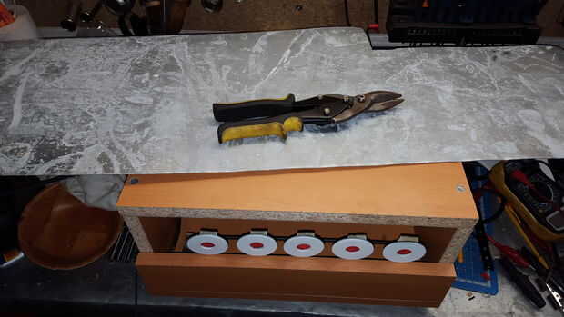 Tablas como Ikea no están un material fuerte y como quiera que el objetivo de ser utilizado también con perdigones de plomo, decidí proteger el frente de la caja.