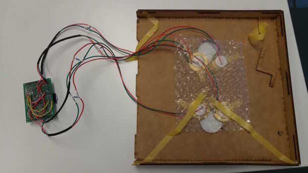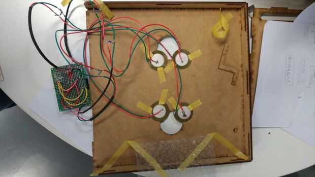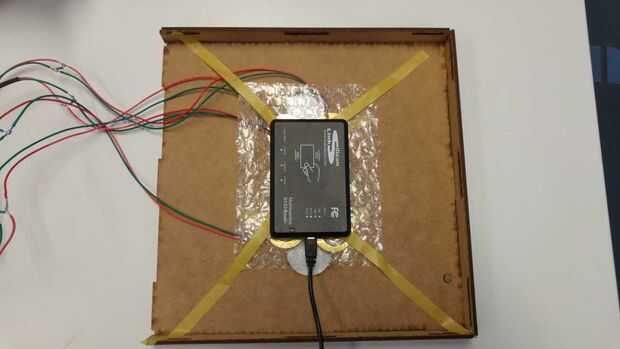 (3) la abertura en la parte superior es para el lector de RFID. Hay una abertura en un lado de la caja para el cable USB. Los cuatro sensores piezoeléctricos para fijarse en la parte inferior del interior de la caja de entrada como la siguiente imagen.