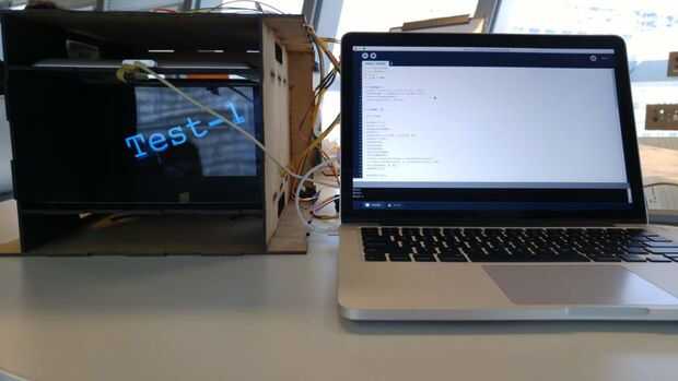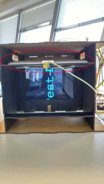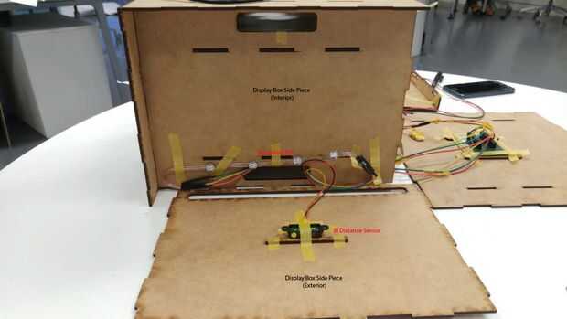 (7) une las luces LED y Sensor de distancia de IR a las piezas laterales de la caja de presentación. Repita para el lado izquierdo y derecho siguiendo la imagen de abajo.