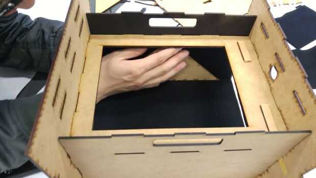 (2) a continuación especificar detalles adicionales que ya se muestra en el video para añadir claridad. El triángulo se coloca dentro de la caja como se muestra en la imagen siguiente (imagen a continuación que se muestra en color madera en cuadro. Debe estar cubierto por sacudimiento negro) para sujetar las 2 piezas de acrílico. Asegúrese de que la posición del triángulo 2 frente a la unos a otros se alinean.