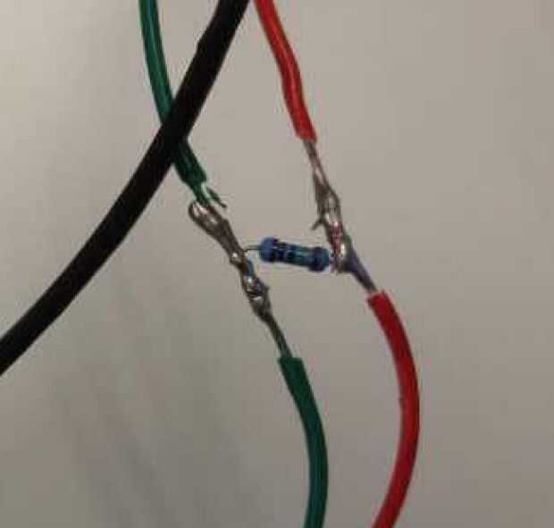Solde un resistor al otro extremo de los dos lados del cable conectado al medidor de piezoeléctrico. Luego soldar otro 2 pedazos de alambre en el otro extremo de la resistencia como la imagen de abajo.