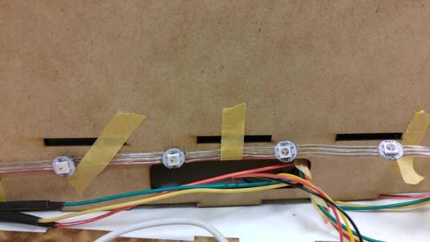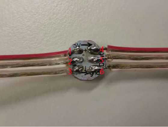 En la parte posterior de cada LED de Neopixel, hay 6 conecta área (marcado abajo). Conecte un cable en cada zona de conexión.