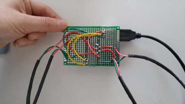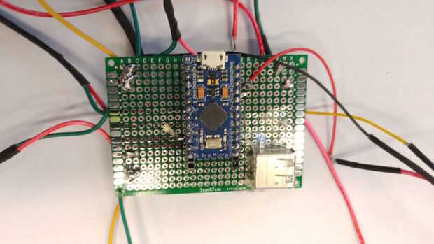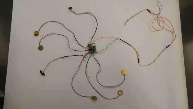 (2) 4 x metros de piezoeléctricos para la detección de la presión de la estampación, 1 x metro piezoeléctrico para detectar la presión de aire de un golpe, sensores de distancia de IR de x 2 y 2 sets de 4 LED de Neopixel cada sello de retroalimentación se detecta son todas soldadas a una placa de Micro Arduino, mientras el lector está conectado a la misma Junta mediante cable USB. Coloque todos los componentes como los cuadros y el esquema a continuación. Usted puede hacer la Junta tan pequeño como sea posible. Coloque todos los componentes como las imágenes de abajo. Usted puede hacer la Junta tan pequeño como sea posible.