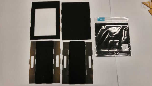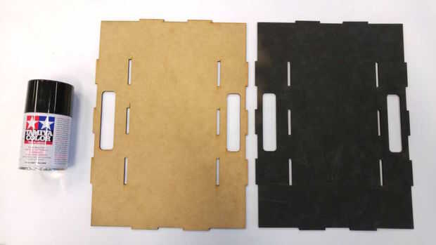 (3) se quedó sin pintura. Por lo tanto, nos pegamos un trozo de tela negra influencia a 6 pedazos de MDF. También hemos añadido 2 piezas de influencia que hemos pintado ya que encontramos que la influencia no es tan reflexiva como Mostrar la pintura proporciona mejor resultado.