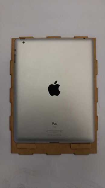 (4) en el lado de MDF tocar el iPad que no es pintado/cubierto por sacudimiento, pegar 2 pedazos de madera con pegamento de madera como se muestra en la imagen para sostener el iPad Mini en su lugar.