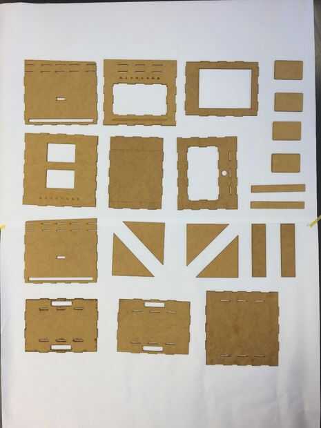 (1) la pantalla y la caja de entrada es el láser de corte de MDF de 3mm. Se puede utilizar otro material que puede ser láser, así como el acrílico. Archivos AI utilizados pueden encontrarse a continuación. Debe resultar en las siguientes piezas.