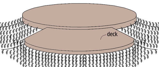 Plataforma opcional. Utilice el mismo método de construcción para crear decks alrededor de la yurta, aunque no necesitan ser aislados. En lugar de escoria en las bolsas y el suelo, se puede utilizar grava. Cubiertas pueden ser de cualquier tamaño o forma que desee. No estás limitado a formas, aunque hay limitaciones a la construcción de paredes construiremos alto, recto – en algún momento que te requieren refuerzo adicional. Pero esto no es una preocupación si usted construir bases construiremos bajo de sólo unos pocos cursos y berma los lados con tierra apisonada.
