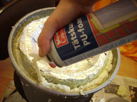 ahora tendrás que llenar los espacios entre el bebedor y el cubo con la construcción de espuma - asegúrate de que cubre tu área de trabajo con periódico, este material es muy pegajosa!