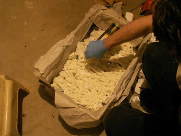 OK ahora tienes un cubo de trozos rotos de espuma de poliestireno y una capa de la pulgada de la materia en el fondo de su molde. su listo para el material de encuadernación (grandes cosas).