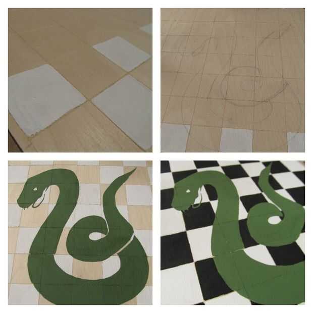 Si desea agregar una imagen impresionante, hacer antes de pintar las plazas. Yo busqué en Google "serpiente potter harry" y encontró la imagen pude mano libre. Lápiz y luego pintar su serpiente en primero antes de hacer los cuadrados. De esta forma que no tienes que pintar el color de la imagen sobre su pintura negra.