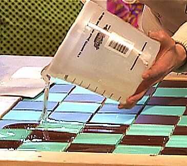 - Para sellar los azulejos y dar a la junta una mirada brillante, como vidrio, aplique dos capas de resina de pour-on, alto brillo (imagen 7). Lea y siga todas las instrucciones de la resina y asegúrese de mezclar bien las dos partes del material.