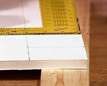 - Una vez seca la pintura, Inicio en una esquina del marco y seco montar las piezas de cartón pluma, alternatig de casillas claras y oscuras en un patrón de tablero de ajedrez. Espacio uniformemente las plazas apart de 1/8".