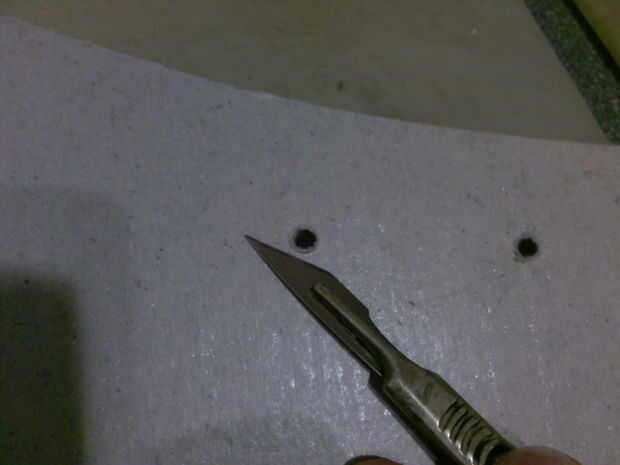Lo mejor es tener un pedazo de madera que se puede taladrar en - esto da un agujero más limpio.
