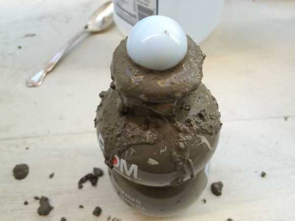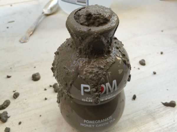 Empezar con las piezas blancas de ajedrez (es decir, liso cemento). Haz todos tus moldes listos antes de mezclar el hormigón: los caballeros tendrán algo para sostenerlos para arriba (yo usé tazas plásticas) y para estar seguro también los obispos. Mezclar el concreto en balde entre cada pieza, esto ayudará a impedir que endurecer antes de que termine, especialmente si tienes una mezcla de cemento curado rápido. Como usted está llenando el molde sacúdalo y suavemente golpee alrededor para eliminar las burbujas y para asegurarse de que el molde esté lleno. Incluso con botellas claras es difícil de ver, tan bang, agitar y jiggle lejos. Una vez que el molde está lleno hasta el borde, aplanar la parte superior con su paleta y coloque sobre una superficie plana y nivelada, para secar. Lamentablemente no fue la mesa que estaba trabajando en nivel, razón por la cual mi Torres parecen miniatura torres de Pisa--nada un molino no puede arreglar, pero es mucho más fácil si te lo dan desde el principio.