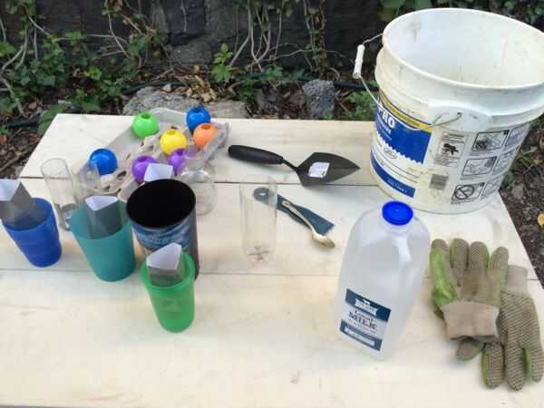 Además, mezcla de hormigón es muy fácil y divertido. Consigue una bolsa premezclada para que usted no tiene que preocuparse acerca de cómo las proporciones adecuadas de cemento portland y agregados (grava arena y pequeña). Añada suficiente agua fría para que el cemento está completamente mojado... luego agregue un poquito más de agua para hacer la textura menos clumpy y fácil de verter. Será más difícil conseguir todas las burbujas de una mezcla más seca, pero no quiere ser tampoco demasiado húmeda y líquida. No te preocupes demasiado por conseguir exactamente, precisamente mojado. No estamos construyendo un puente, y mezclas con diferentes grados de humedad dará buenos resultados.