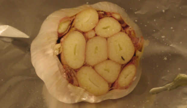 1. preparar el ajo como se describe anteriormente (cortar una sección del extremo puntiagudo y aplicando un poco de aceite de oliva y sal hasta el corte final)