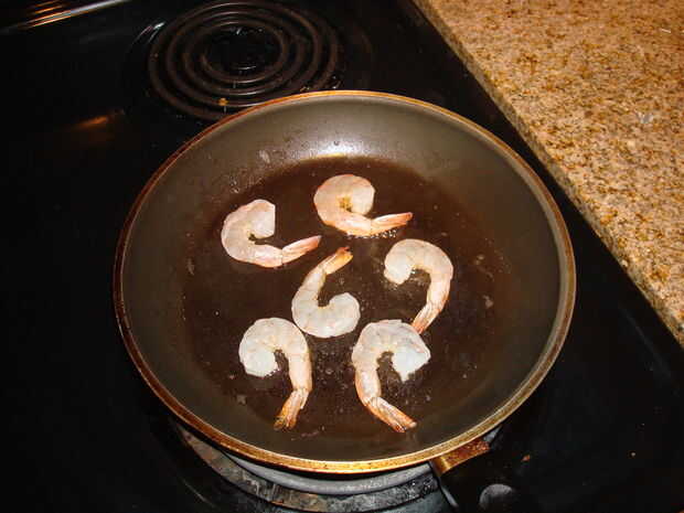 Derretir la mantequilla en un sauté de la cacerola sobre fuego medio.  Cuando la mantequilla se haya derretido y las burbujas empiezan a desplomarse, mezcle los camarones (pelados y desvenados).  Cuando los camarones están empezando a rosa, voltee los camarones y mezclar el ajo picado y 1 cucharada de la salsa caliente.  Cocine hasta que los camarones estén cocidos, probablemente por un minuto o dos.