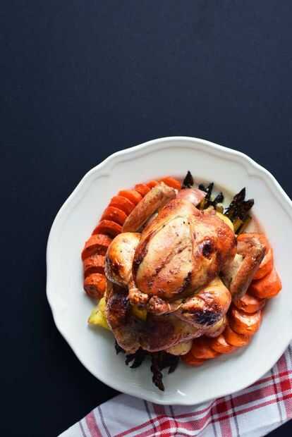 Usted puede asar casi cualquier tipo de verduras con pollo, teniendo en cuenta que el asado en el horno durante aproximadamente una hora para que las verduras deben ser capaces de soportar el calor por mucho tiempo sin ser blanda. Recogí algunos espárragos puesto que está actualmente en temporada y colocar en el horno con la carne asada. No hace falta decirlo, llegaron super suave y fibroso. Así que la próxima vez, quisiera o esperar hasta el minuto 50 para ponerlas en el asado, o simplemente saltearlos por separado.