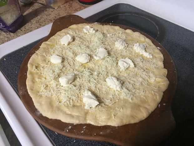 Esto es una cena rápida y sana, incluso nuestros niños les encanta!Tiempo de preparación es tan sólo unos 10 minutos o menos.Esta es una de mis pizzas favoritas.  Mantequilla y queso, cada vez que lo cocino tengo que hacer 2 sólo para la familia.  He