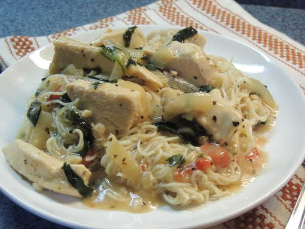 He creado este plato porque mi generalmente no tan exigente de 9 años no le gustó mi cena China en casa. No le gustaba es más allá de mí como nos encanta la comida China (y quién no?)!!!! Después de obligarla a comer la primera noche la culpa de mi mamá y yo decidimos cocinar algo que sabía que le encantaría. Mientras yo estaba cocinando este delicioso plato en el lugar, mi cocina comenzó a oler como Olive Garden. Es entonces cuando supe iba a ser un éxito. Fue tan bueno que me salté al chino yo! Yo cerré los ojos, fingió salió a cenar y disfrutar de la comida cremosa. Si eres un fan del pollo a la italiana y salsa o sólo amor Olive Garden como yo, necesita probar este plato! Se ha hecho servir 2 (perfecto para la noche de la fecha en) pero puede ser doblado fácilmente para alimentar a una familia entera.