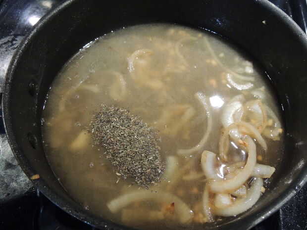 1. Una vez que las cebollas estén suaves, añadir el vino para Desglasar la sartén. Usando una cuchara raspe nada que se ha pegado a la bandeja. Tiene un montón de sabor!