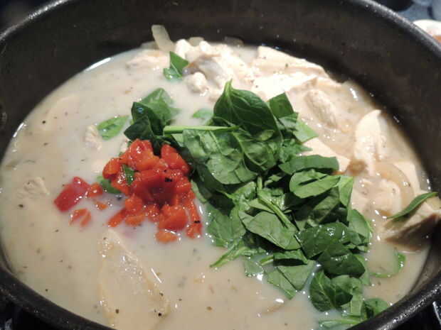 3. Volver el pollo a la cacerola y añadir la leche, pimiento rojo y espinacas. Mezclar los ingredientes y cocinar a fuego lento durante 10-15 minutos hasta que el pollo esté cocinado y la salsa espese un poco.