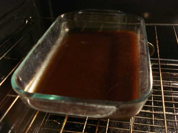 Entonces comenzó a tratar Super saturado de la solución con sal marina. Después de añadir más sal 25g, descubrí que la solución era demasiado gruesa y añade 100mL más de agua. La solución en ese momento parecía demasiado delgada. Luego agregar 3g de sal ahumada y 5g de sal de mar y comenzó agregando agua en incrementos de 15mL. Después de 5 tales incrementos, decidí que la solución era apropiadamente diluida en cuanto a ser sobresaturada en ebullición. Luego agrega el ajo negro y ajo picado, hierve durante 2 minutos más y vierte la mezcla a través de un filtro de plástico que he comprado online en un recipiente de Pyrex de 2,2 qt. Luego fue colocado en un horno a 275F, como se muestra.