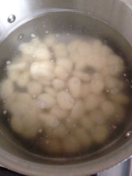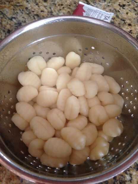 Poner una olla de agua a hervir. Añadir los ñoquis y cocinar por 3 minutos, hasta que los ñoquis flotan en la parte superior. Luego cuela y descarga en un recipiente.