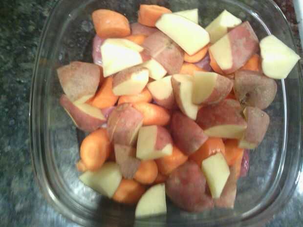 Cortar las patatas en la consistencia deseada y colocar en la cazuela con las zanahorias y el puerto.
