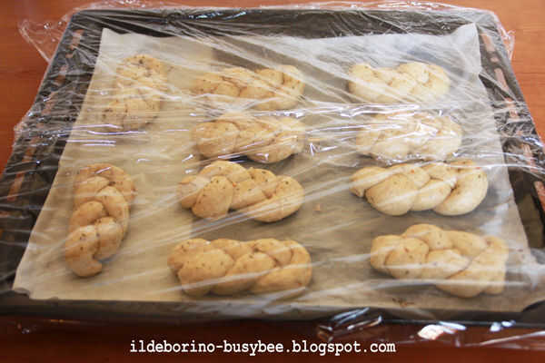 Coloque su rollo trenzado en una placa para horno forrada con papel pergamino. Hacer los otros rollos trenzados. Cepille todas las trenzas con el resto de la mantequilla derretida y deje reposar por otros 30-40 minutos.