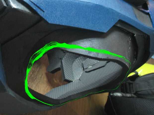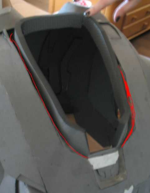 Los agujeros del brazo son bastante simples, toma su cuchillo y cortó un agujero más grande, como la línea verde en la foto a continuación. Esto puede dejar un borde irregulares, que se puede arreglar con el dremel lijadora aconsejada en el paso 1. Asegúrese de que al utilizarlo no presione demasiado a la espuma de la lijadora, quieres varios pases suaves para asegurarse de que usted consigue un bonito, incluso lijado... Una vez lijada, simplemente pintar con cualquier pintura negra que elige, aunque yo uso Krylon
