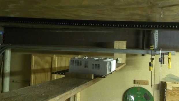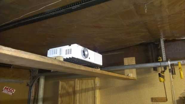 Si utiliza su garaje como un lugar de reunión como un taller a veces tienes que ser creativo con su uso del espacio. La posición perfecta para un proyector en mi espacio está directamente debajo de la puerta del garaje abierta. No sería posible colgar un montaje del techo. Esto debajo del estante de la puerta de garage puede abrir algunas posibilidades para el espacio previamente inutilizable. Con este diseño puede ser utilizado casi toda la longitud de la puerta pista, excepto que la puerta hace la vuelta vertical.