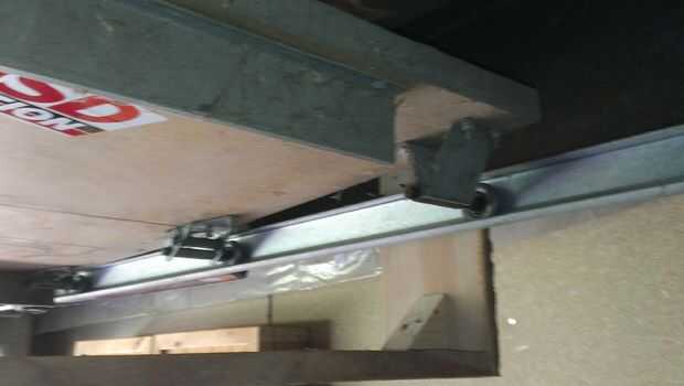 Usé algunas abrazaderas para colgar temporalmente la plataforma de las pistas de puerta a prueba de la separación. He creado una matriz de agujeros que se utiliza para ajustar la altura una vez instalada. Pegue los brazos colgantes a la plataforma, también he añadido un pequeño 45 grados aparato ortopédico para ayudar con la carga.