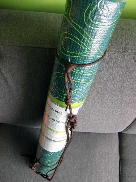 necesitaba una eslinga ajustable, barata para un nuevo mat de yoga y esto es lo que se me ocurrió. Utilicé un par de cordones redondos, pero usted podría apenas como fácilmente uso paracord o alguna otra cuerda.