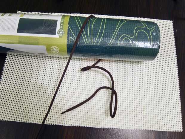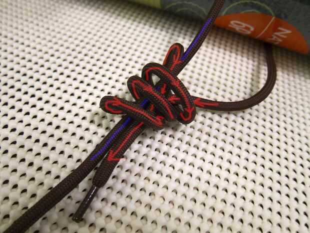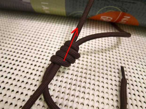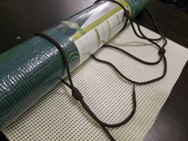 1. Tome uno de tus cordones y envuelva el extremo alrededor de la estera de la yoga. Atar un nudo del resbalón--esto permite que el nudo y apriete el cordón alrededor de la estera. Desea que el nudo que sólo apretado lo suficiente como para que no deslice en su propio. En la foto de abajo, he empatado alguna variante de un nudo del resbalón. Puede seguir o aprender a atar un deslizamiento apropiado no aquí.