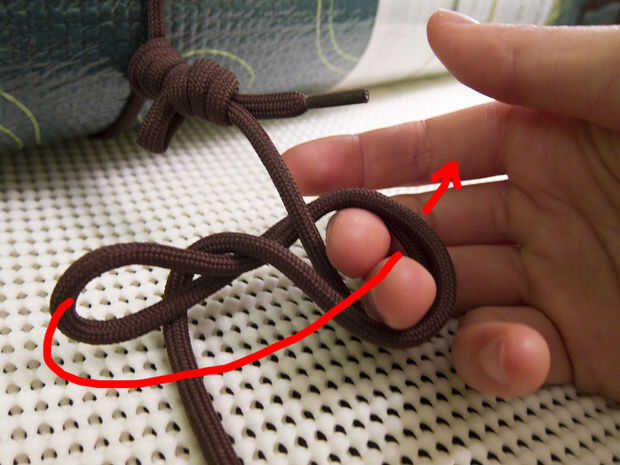 2. Tome el extremo libre del otro cordón y cuerdas a través del bucle que acaba de hacer. Baje el extremo libre sobre sí misma y atar otro nudo del resbalón. Este nudo antideslizante le permitirá ajustar la longitud de la eslinga.