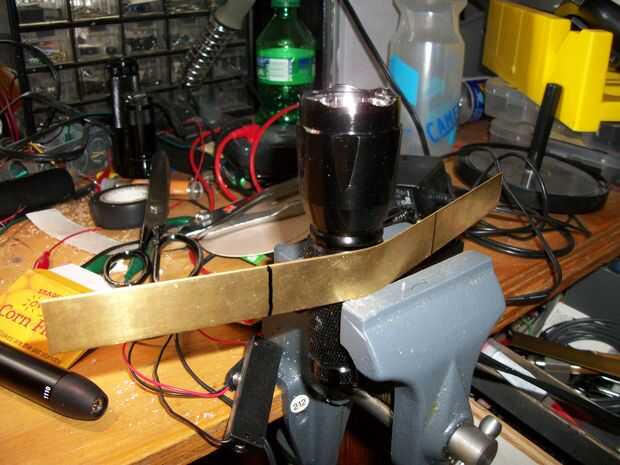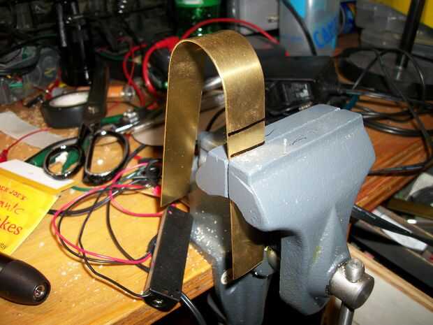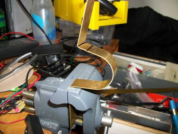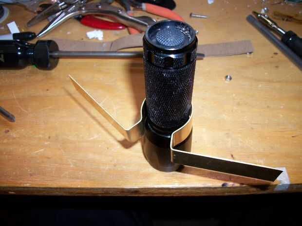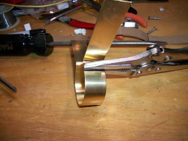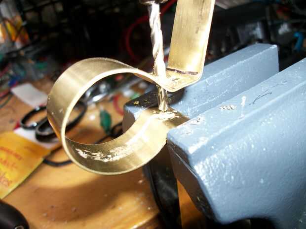 Bien, fije esa linterna en la prensa (ligeramente) y empezar a doblar la tira de cobre amarillo alrededor de él. Espero que no utilizan una pieza que era demasiado gruesa, ya que esto haría parte de un real dolor en el trasero. Doblar todo aproximadamente a las dimensiones que usted necesita, hacer las curvas que va a crear las "alas del montaje" y los pequeños nichos donde iremos y luego perforar los agujeros de los tornillos de apriete. Mire a través de las descripciones de imagen para consejos para taladrar los agujeros. Es poco práctico y mucho tiempo para intentar averiguar antes dónde perforar y hacer curvas, por lo que esto va a ser un proceso algo impreciso. Si eres muy quisquillosos, puede tratar de hacer todo esto primero en sketchup o algún otro programa de CAD. Pero si vas a pasar por todo ese problema, probablemente ya tiene una impresora 3D y debe encontrar la manera uso para hacer una pieza de plástico que hace la misma cosa.